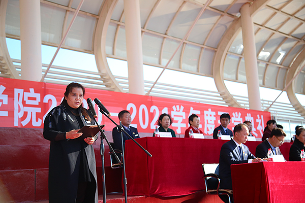 教师代表,财经分院的王丹老师对新同学提出了要心有梦想、心有家国、心有坚持、心怀感恩,愿同学们不负青春、不负韶华、不负时代,秉承“德意周厚、知行合一”的校训,怀揣梦想,逐梦前行,为实现中华民族伟大复兴贡献聪明才智。