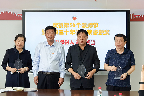 座谈会首先由刘艳主席宣读《关于为从事教育工作30周年教职工荣誉颁奖的决定》,学院党委书记王正东为从教30年教工代表颁发奖牌。