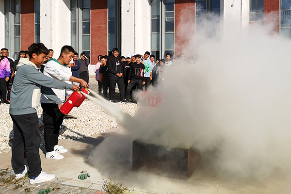 在系列安全讲座之后,学院安全保卫处组织同学们进行了消防演练实操训练,安全保卫处的老师们详细讲解了灭火器的种类、使用方法、日常维护等相关知识,并现场示范了干粉灭火器的使用步骤。