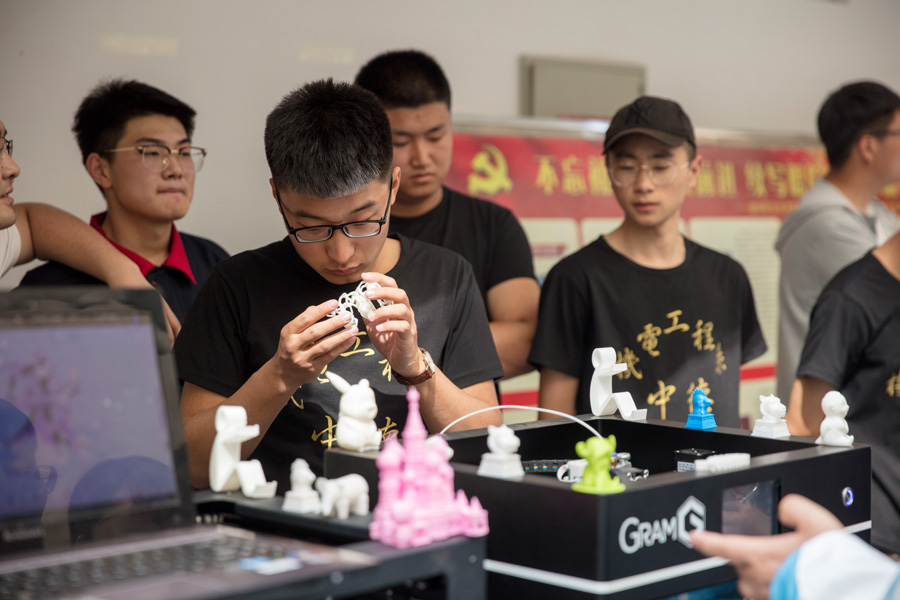 机电工程系展示的作品也吸引了众多学生的眼球,他们依次展示了机械手臂、游梁式抽油机、司特林发动机、轨道识别小车、3D打印等,学生们超凡的技艺和精巧的作品,让参观者赞叹不已,纷纷垂询和跃跃欲试。