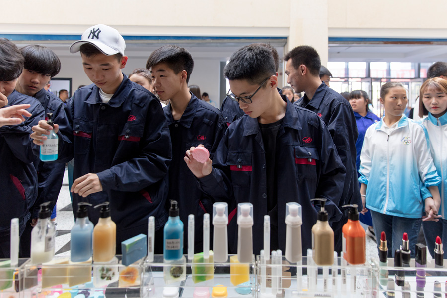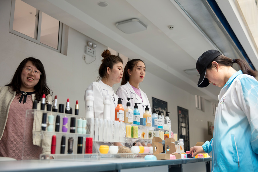 化学工程系展示的化工类专业学生制作的口红、香皂、洗面奶等化工产品,吸引了更多女生的关注,有很多女生在参观之后还领到了赠品,美不自禁,甚至欢呼雀跃。