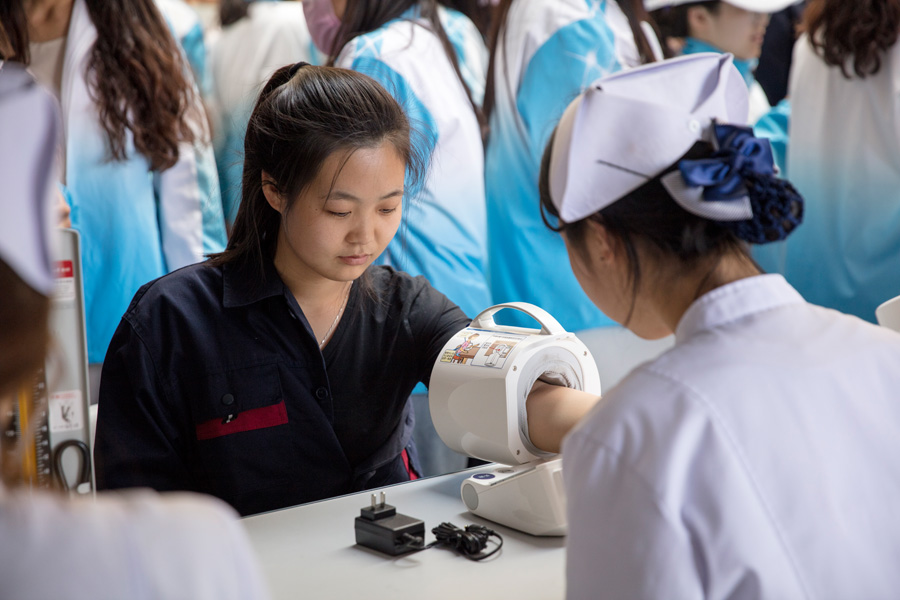 医疗护理分院选派师生为参观者进行了急救知识宣传、测量血压血糖、做心电图、心肺复苏现场演示等,并热心为参观者进行了健康知识宣传和讲解。