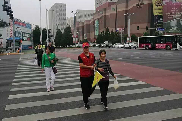 9月15日,学院 128 名志愿者踏上了志愿服务之路。志愿者分两人一组分别守在4个方向路口,挥举着文明交通小黄旗向行人、车辆发出指示,同时对非机动车和行人的越线停靠、不文明穿行马路等行为进行监督、劝阻。