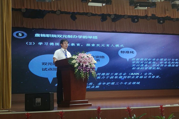 张洪福副院长作为辽宁地区代表,在大会上作了题为“辽宁省双元制办学情况及经验”的主旨汇报,从辽宁职业教育办双元制的背景、优势条件、存在问题等维度对辽宁各地区的双元制办学现状进行了剖析,同时重点对盘锦乃至盘锦职院的双元育人模式改革经验进行了详细阐述,张院长生动的演讲既为大会增添了重要内容,同时也分享了本地区双元制办学经验,宣传了盘锦及盘锦职院这一靓丽名片。