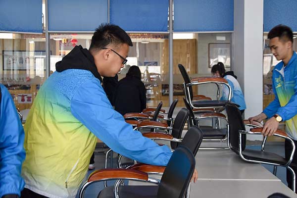 随后按照所分派的区域、库、室开展整理图书、擦书架、抹书桌、拖地等义务劳动。同学们分工明确,有条不紊、干劲十足,用提前准备的抹布,认真仔细地清理书架上的灰尘;整理书架上没有放整齐的图书;对角落处和细微的垃圾、杂物都进行了彻底清理,不留卫生死角。他们的身影出现在图书馆的各个角落,虽然累在其中,但也其乐融融。