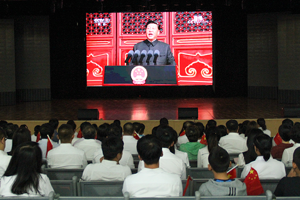 10月1日上午9时,学院组织领导班子成员,全体党支部书记、副书记,全体辅导员,学生工作处、团委全体工作人员以及在校学生共计三百余人,于学院文化中心三楼集中收看庆祝中华人民共...