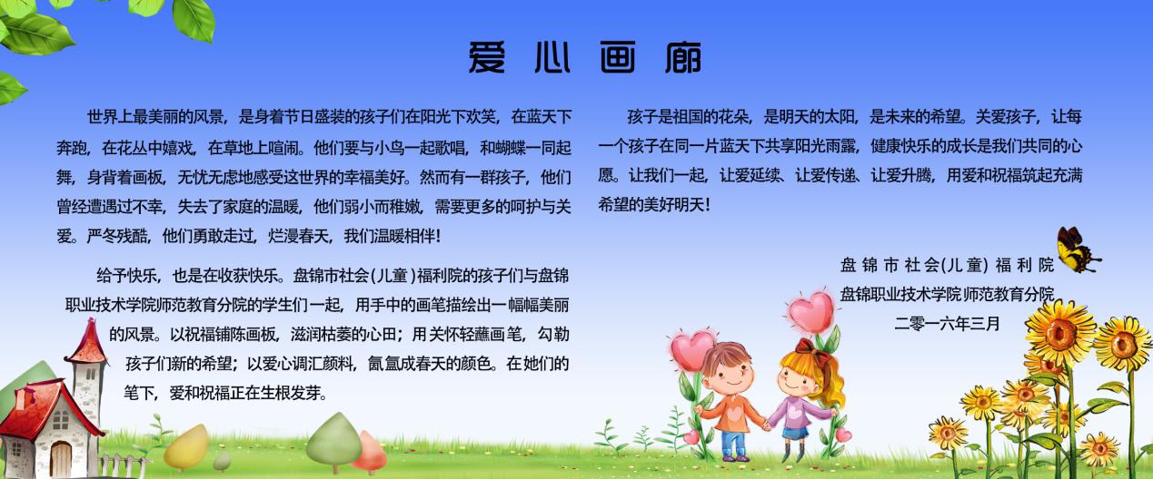 2016-04-214月20日下午1:30,师范教育分院学生会、团总支部分学生代表在王中宇副书记和辅导员老师的组织带领下,将自己的美术画作捐献给盘锦市社会(儿童)福利院,用一幅幅充满童趣的画作为...