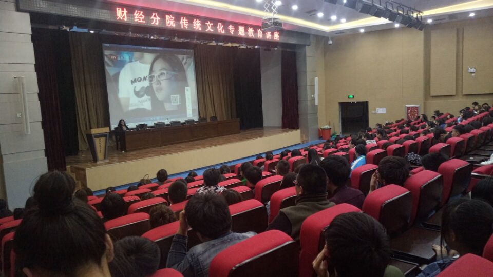 2016-04-29为了进一步发挥传统文化在培育和践行社会主义核心价值观中的“精神根基”作用,不断提高大学生的文化素质和公民道德修养,财经分院于2016年4月26日晚,在图书馆报告厅举办了以“读书...